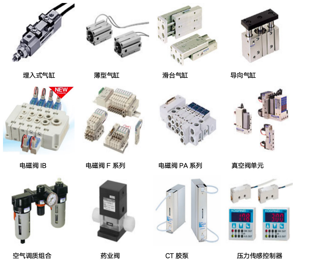 小金井的产品包括(KOGANEI)高性能气动元件气缸,摇摆气缸,气动爪,电磁阀,手动阀,止回阀,真空阀发生器,吸盘,真空笔式气缸,复式气缸,模具气缸,磁性干燥器,调压阀,压力阀,小金井除静电器,验静电器等。